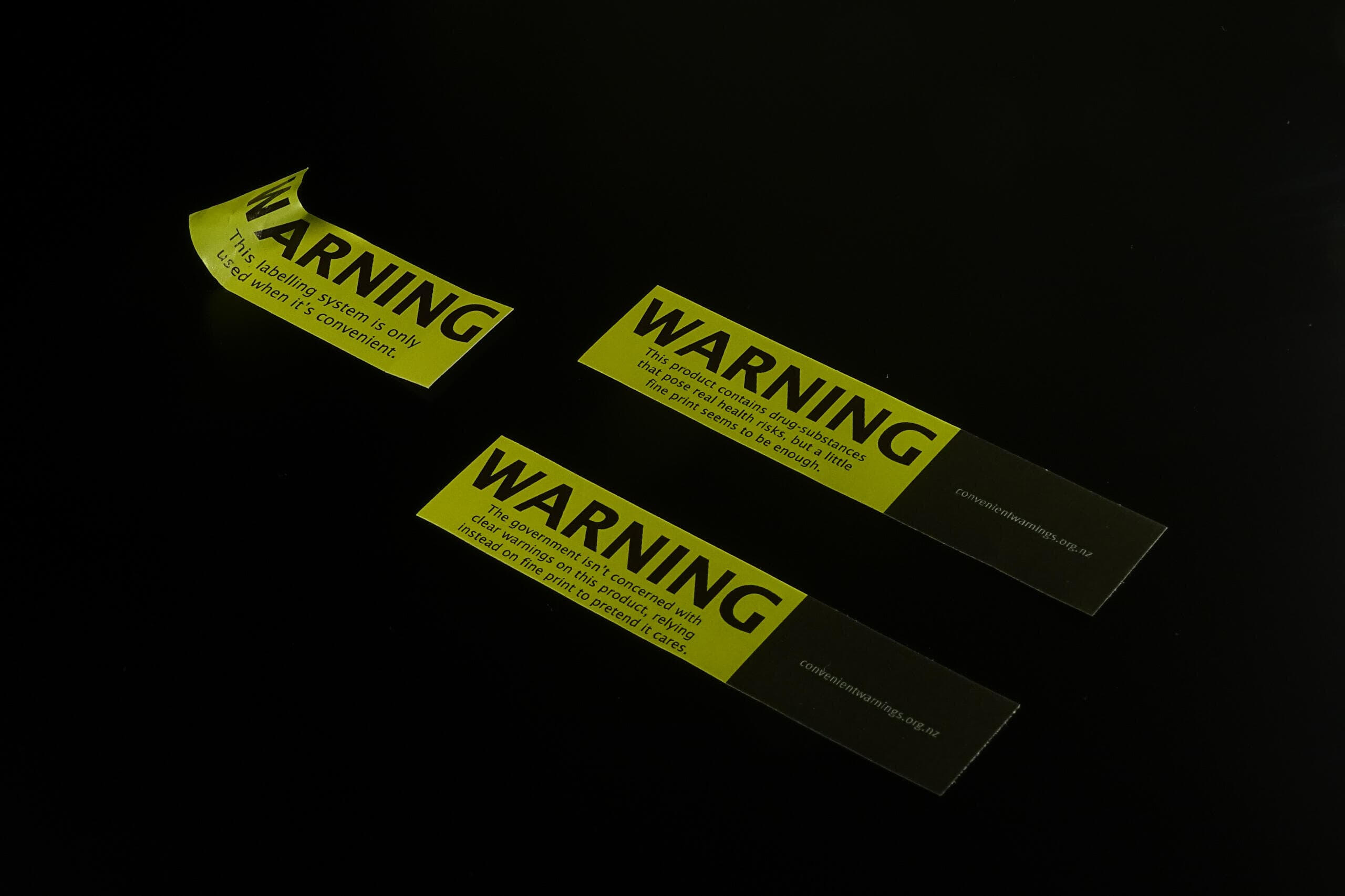 New Zealand's approach to health regulation warnings is ridiculously uneven. Cigarettes are covered in photos of diseased lungs by law, but alcohol, energy drinks, and painkillers (all with their own serious risks) get off with off with an, often undescriptive, small disclaimer on the back while looking like lifestyle products.Convenient Warnings started as a DIY protest: take the government-mandated cigarette labelling system and apply it to everything else that causes harm.I started by redesigning common product packaging using those same brutal warning systems: ugly colours, standardised fonts, and grotesque warnings, then shot them like ad campaigns. The end results were somewhere between believable and absurd, forcing people to double-take on their favourite products. Alongside the posters, I came up with a guerilla sticker campaign: tear-off flyers and handouts placed around universities and public spaces that let others label products they felt were deserving of a warning. It was about trying to expand the conversation to more people, not just to point fingers.